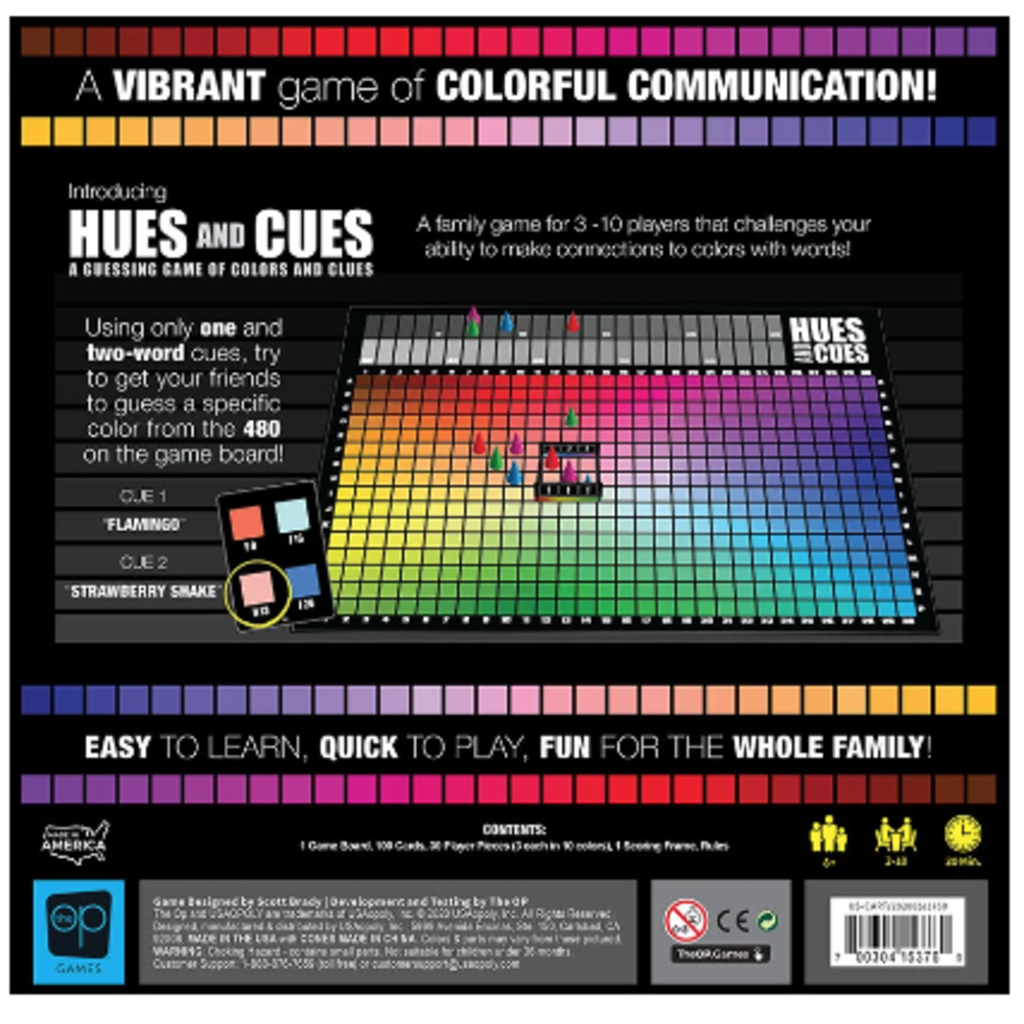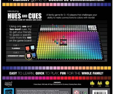 What hue do you think of when we say “apple”? Hues and Cues is a vibrant game of colorful communication where players are challenged to make connections to colors with words. Using only one and two-word cues, players try to get others to guess a specific hue from the 480 colors on the game board. The closer the guesses are to the target, the more points you earn. Since everyone imagines colors differently, connecting colors and clues has never been this much fun!