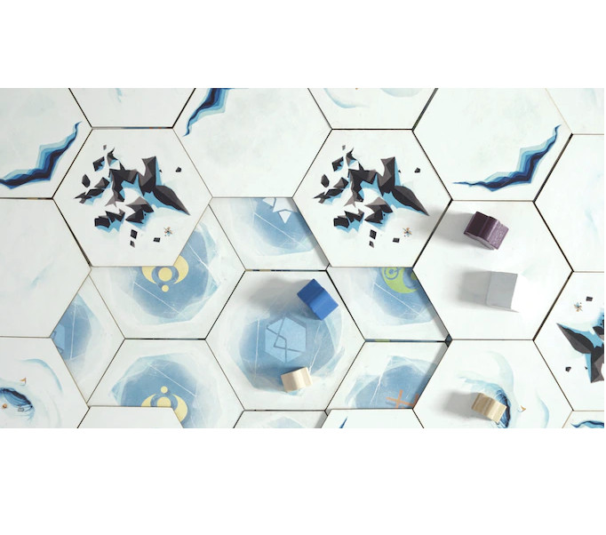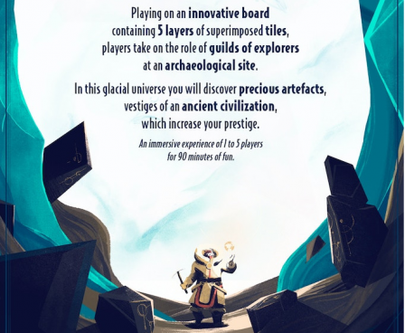 Players are archeologists exploring tiles they can remove. There are 5 levels of tiles in the game. The first one corresponds to the ice sheet level. The second, third and fourth represent surface, intermediate and deep artifacts levels. the last one is the edifice level. Archeologists dig these tiles in order to collect artifacts which gave them reputation points. The ice sheet tiles removed by a player can be played as a helping action for him. The tiles are game changing rules and represent legacy material to discover as we go along.