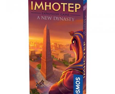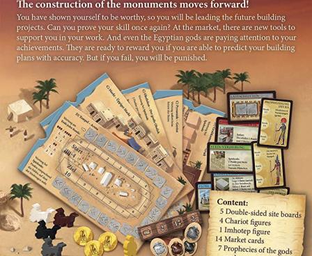 Imhotep: A New Dynasty adds five new places, fourteen market cards, seven god cards, four chariots, and 56 tiles to the Imhotep base game. God cards let players predict the progress of different buildings, with them being rewarded at the end of the game if they're correct and otherwise being punished.