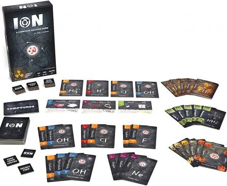 ION: A Compound Building Game is a card drafting game where players select from a number of available Ion Cards and Noble Gas cards with the goal of creating sets of compounds and inert noble gases.