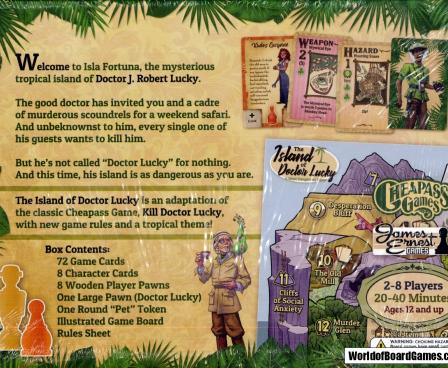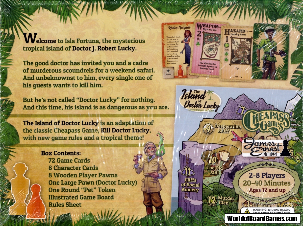 The hunter becomes the hunted in The Island of Doctor Lucky. In this tropical spin on Kill Doctor Lucky, you're still competing to kill the old man, but this time you picked a dangerous place to do it: Isla Fortuna, his mysterious tropical island. You can still attempt murder the old fashioned way, using a weapon when no one can see you, or you can take advantage of the new hazard cards to hit him from anywhere else on the map! While hazards aren't usually as strong as a murder attempt, they give you faster movement for the rest of the game. What's more, you can also throw hazards at players!