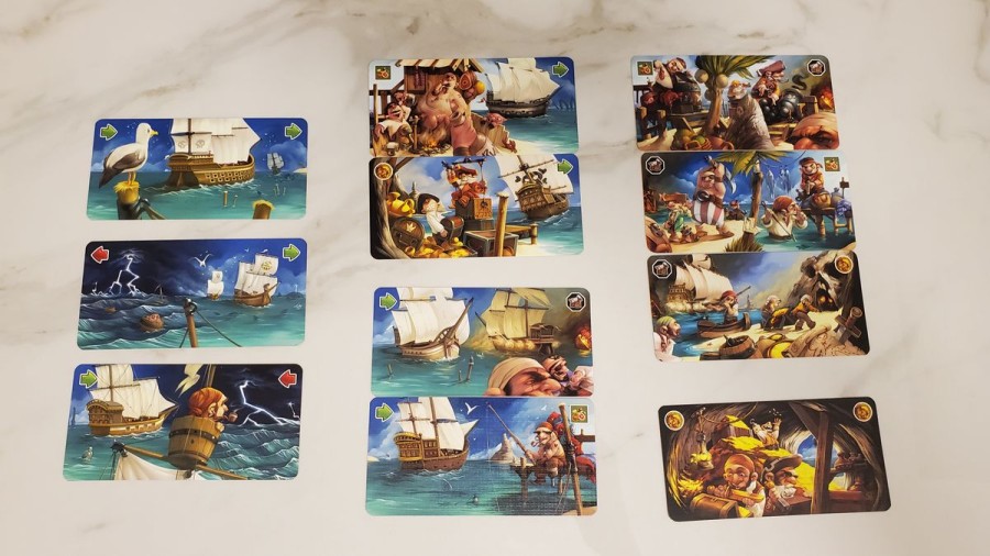 Summary: This is a pirate-themed tactical race game with player interaction and side goals (e.g. detouring for treasure). The winner is the player who best balances their position in the race with their success at the side goals.