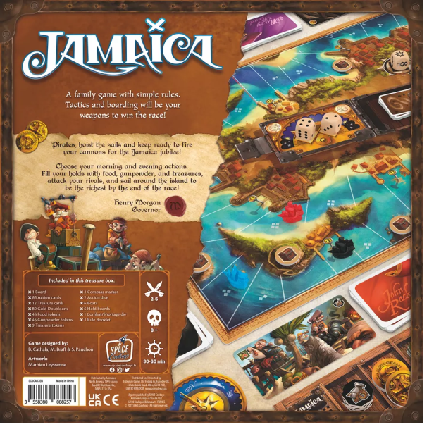 Goal: The game ends on the turn when at least one player's ship reaches the finish line, completing one circuit around the island of Jamaica. At that point, players are awarded different amounts of gold in accordance with how far away from the finish line they were when the race concluded. This gold is added to any gold a player gathered along the way by detouring from the race to search for valuable treasure, by stealing gold or treasure from other players, or just by loading gold as directed by the cards the player played during the race. The player with the most total gold acquired through all these means is then declared the winner.