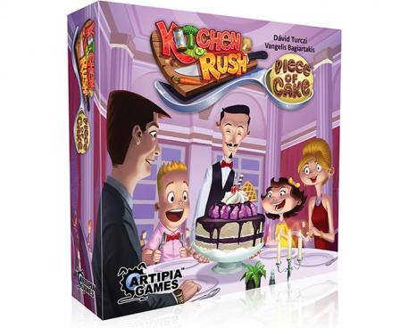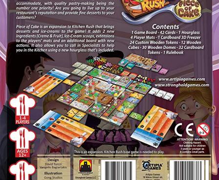 Piece of Cake, an expansion for Kitchen Rush, adds a new type of order with desserts, ice-cream mini-orders, two new ingredients (crème and fruit with custom-shaped wooden tokens), and a new type of token (ice cream scoops). An extension to the game's board introduces additional actions for the players, and there is also a 60" hourglass for a specialist worker who can perform improved versions of the available actions.