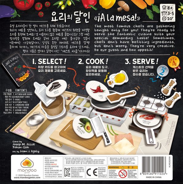 A la mesa is a creative cooking game designed by Josep M. Allué and Yohan Goh. In a round, one player takes the role of a "guest", while the other players become chefs and draft four ingredient cards. Before doing this, the guest draws as many condition cards as the number of chefs, then gives one card to each chef.