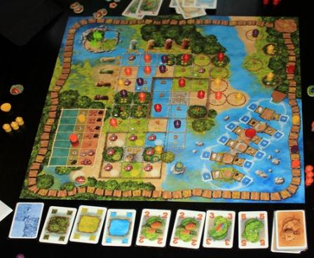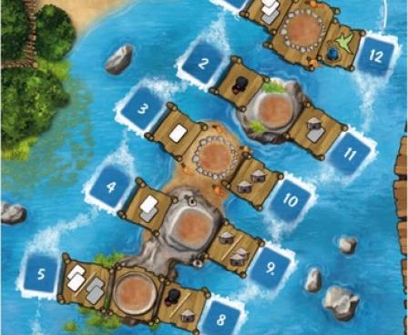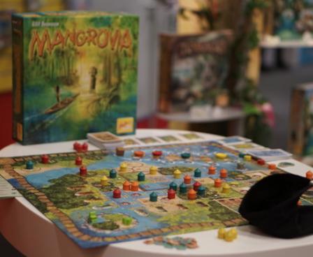 In Mangrovia, a light "gamer's game"/family game with a Caribbean mangrove setting, a clever role selection mechanism allows the players to choose two different bonuses/actions as well as the turn order in which they want these actions to be carried out all by placing just one marker. Victory is achievable through a number of viable options, which guarantees high re-playability.