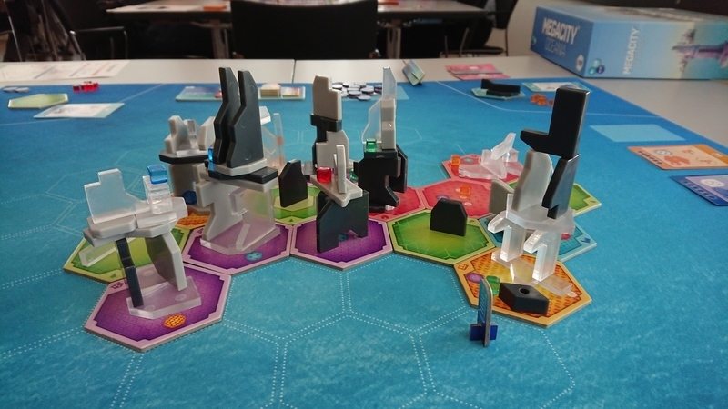 Players create a brand new MegaCity by collecting Building Tiles, Building Pieces and Contracts. However, this is not a co-operative game - you are battling to score Prestige points based upon the contracts you complete. Players can also gain bonus Prestige points by creating tallest buildings, using a single material, and placing monuments in Parks. At the end of the game, Awards are handed out that contribute to the final score, and points are lost if players have any pieces left over in their personal supplies. Whoever has the highest total is declared the winner, and the finest architect in your new MegaCity.