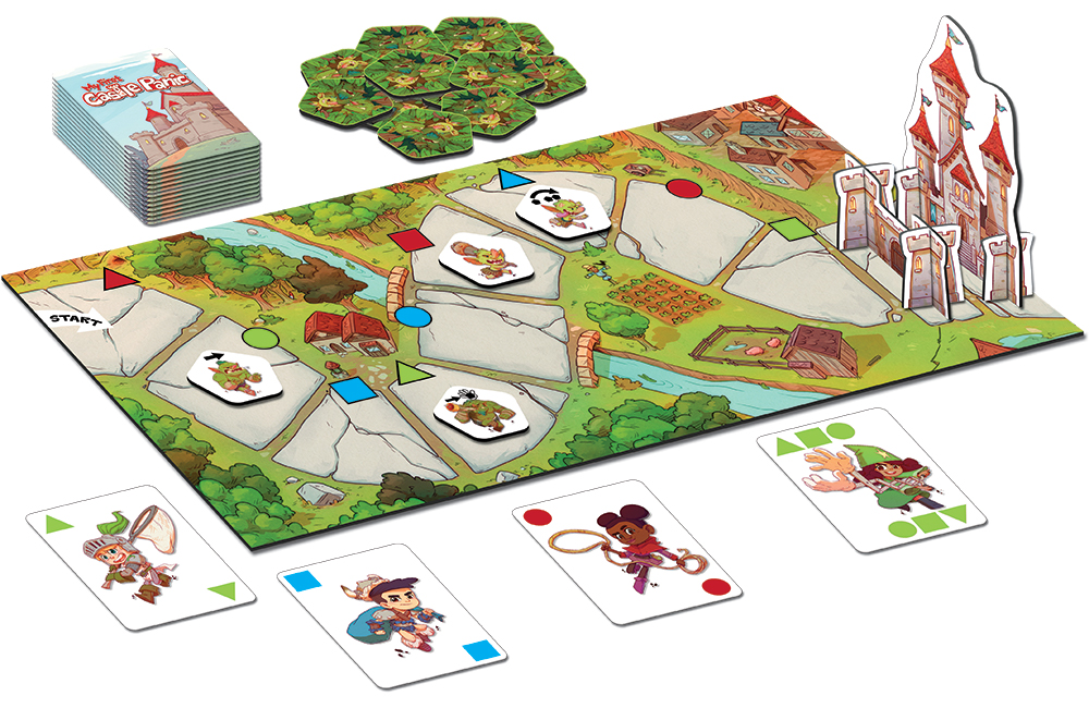 In the game, monsters follow a single path toward a single, large, eye-catching castle, which is protected by one wall. Each step toward the castle is identified by a color and a shape. Players hold cards in their hands with cute defenders who also have a color and shape. When a card is played that matches the location of the monster, that monster is captured and thrown in the dungeon. Tension builds as more monsters are placed and move along the path toward the castle. If the castle is destroyed, the players lose; if it still stands when all the monsters are in the dungeon, the players win.