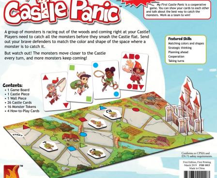 My First Castle Panic, like its predecessor Castle Panic, is a co-operative game in which players work together to defend their castle, but this game removes the reading requirement of the earlier one and fosters the development of educational skills, such as identifying colors and shapes, problem solving, and turn taking.