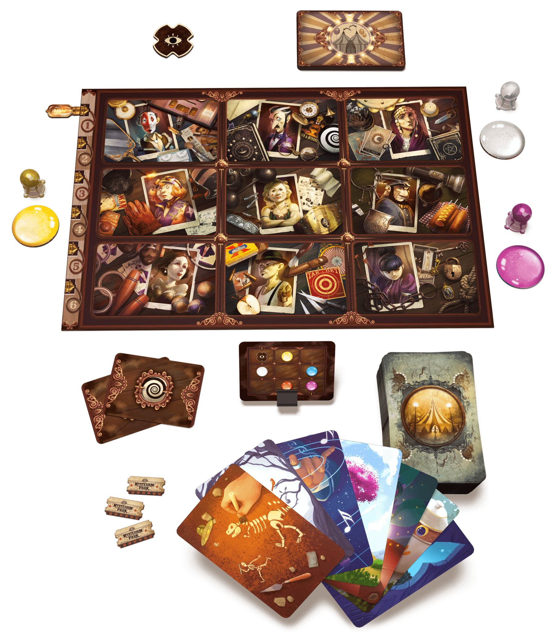 Set in the lights of a 1950's US fairground, Mysterium Park shares the same core mechanism with the famous award-winning game it reimplements, though bringing a different approach: it is smaller and faster, thanks to very quick setup and simplified rules.