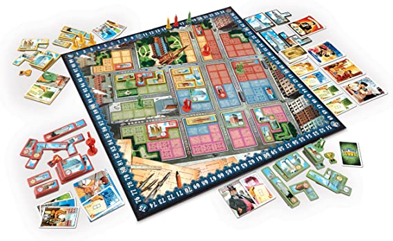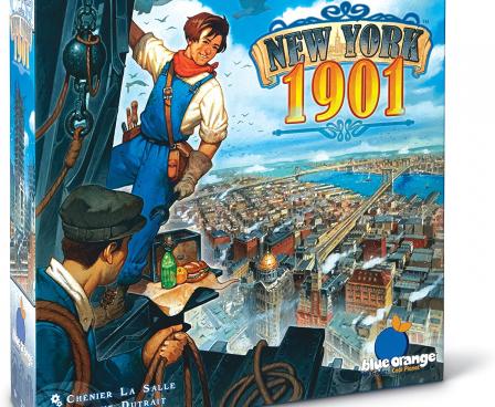 In New York 1901, the players are building skyscrapers on a map of New York's Financial District. Players take location cards from a cards' display and then use 2-3 of those location cards to place tetris-shaped building tiles on the board. They first build bronze level buildings. Later in the game those buildings can be replaced by silver level and then gold level buildings.