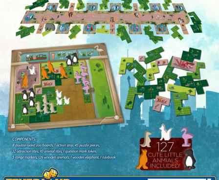 Puzzling and animal breeding: Designer Uwe Rosenberg is at his best! In New York Zoo, you are constructing an animal park. Build animal enclosures, introduce new animals and raise their offspring. The game play is straight forward as you have only two turn options: Puzzle a new enclosure tile into your zoo area or gain new animals to populate your animal encounters. But be sure to time your actions well since you want your zoo to participate in as many animal breedings as possible.