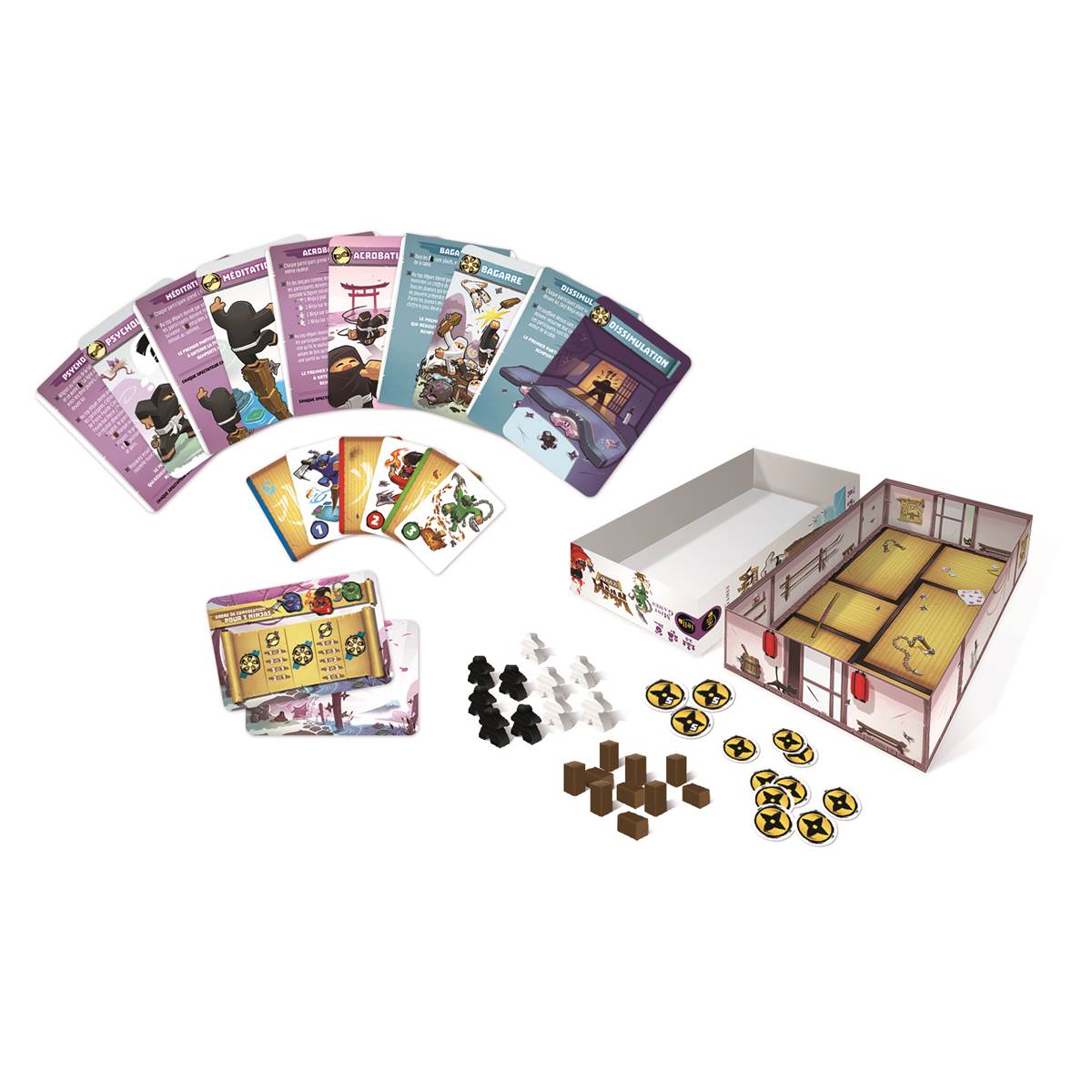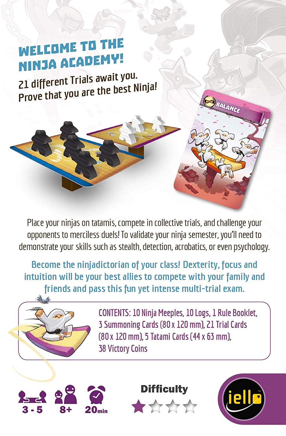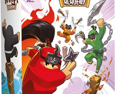As an apprentice Ninja, it’s time for you to show all your skills in challenging and exciting tricky trials. Will you be quicker, stronger, smarter…. or simply more concentrated than your opponents? Your training alternates collective trials and duels, in a series of varied tests drawn randomly. But whether you are challenging the whole group and head-to-head with another ninja, there will be only one rule: be the best at your trial! For example, try to be the first player to place a Ninja meeple on each of your fingertips! Try to guess how many ninjas your opponent put in the box just by shaking it! Be the quickest to assemble 5 wood logs vertically! Be strong enough to collect points depending on your score, but be also strategic enough when you bet on the winner of each duel! Ninja Academy is a hilarious, fast-paced and highly replayable new dexterity game!