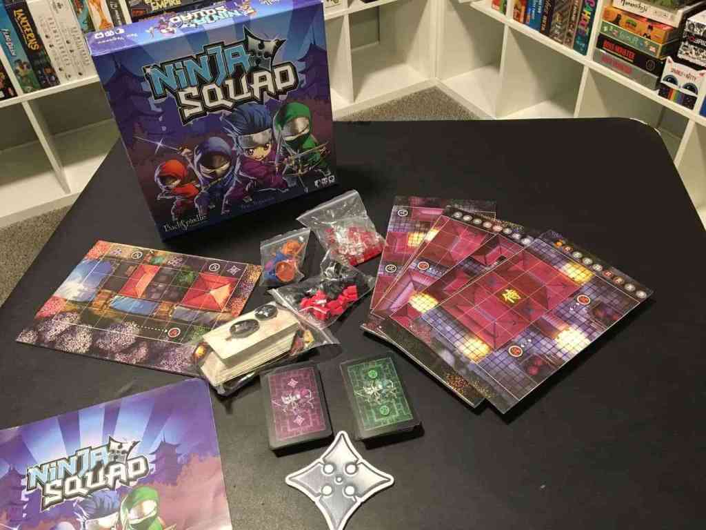 The first half of Ninja Squad is a cooperative game in which players take on the role of ninjas and try to sneak past the guards and lanterns to get to the Shogun's palace. The reverse side of the game board is used for the second half of the game, which is a player versus player race game through the imperial gardens. The first ninja to reach the blue forest will claim the glory.