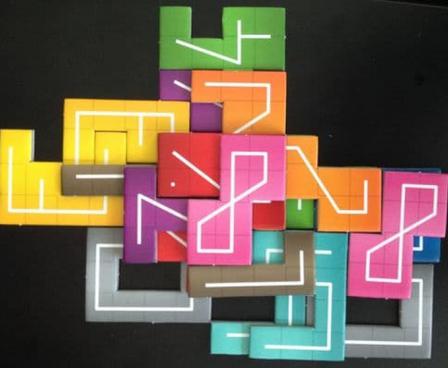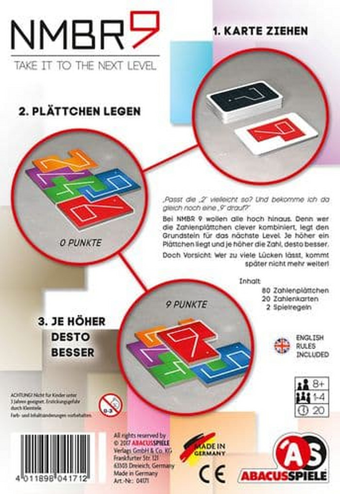 The game includes twenty cards numbered 0-9 twice and eighty tiles numbered 0-9; each number tile is composed of squares in some arrangement. After shuffling the deck of cards, draw and reveal the first card. Each player takes a number tile matching the card and places it on the table. With each new card drawn after that, each player takes the appropriate number tile, then adds it to the tiles that they already have in play, with each player building their own arrangement of tiles.