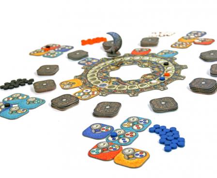 On each turn, you have to decide which new tile from the moon wheel to place in front of you. Every new tile brings a new task you have to fulfill. In order to do so, you need to place tiles of the correct color adjacent to the task you want to complete, but these of course again bring you new tasks. Each time a task is solved, you may place one of your markers on it. So decide wisely and be the first one to place all your markers.