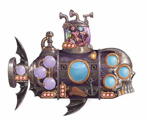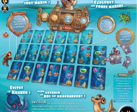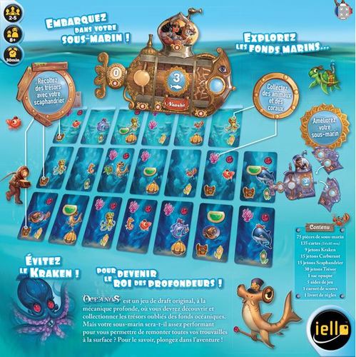 Each player pilots her own submarine trying to spot the most underwater species and the largest coral reef, sending scuba-divers after forgotten treasures, collecting precious crystals to upgrade their ship and to escape the fearsome kraken's gaze...