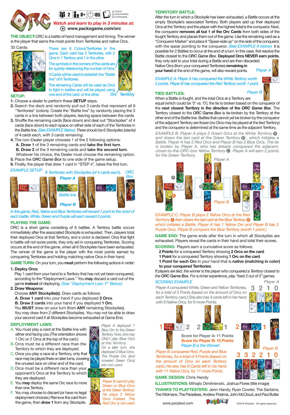 A Territory battle occurs immediately after the Stockpile next to a Territory is exhausted. Then, players total their deployed Orcs at that Territory, and a victor will be declared. Orcs that fight in battle will not score points, they only help conquer Territories. Scoring occurs at the end of the game, when all Stockpiles have been exhausted. The player who conquers the most valuable Territories and holds native Orcs in their hand (matching those lands), is the winner!