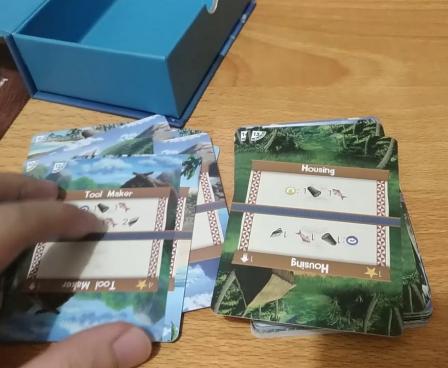Each card has four states or positions. The face-up, top section is the active area on each card and represents the card's current state. Through upgrading your cards with rotate and flip allowing you to access the other sections of each card and improve your village by increasing resource production and gaining more victory points.