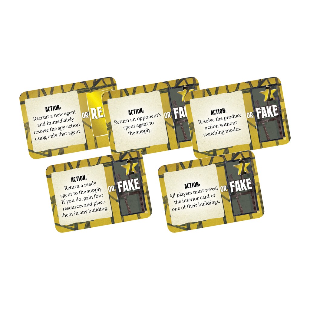 You score points by producing goods in your industrial buildings, exposing opponents' fake buildings with spies, constructing government and cultural buildings, and passing off fake buildings as real ones. The player with the most points at the end of the game wins!