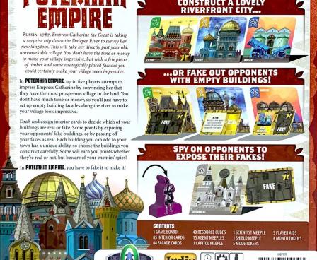 In Potemkin Empire, you play the role of a mayor of a small Russian village. You attempt to impress Empress Catherine by convincing her that you have the most prosperous and stable village in the land. But with her visit quickly approaching there's no time to really fix your village, so you're just going to have to make it look as impressive as possible. That is to say, you're faking it. You'll accomplish this by drafting interior cards that are either real or fake, then combining them with facades to construct an imposing, if flimsy, kingdom.