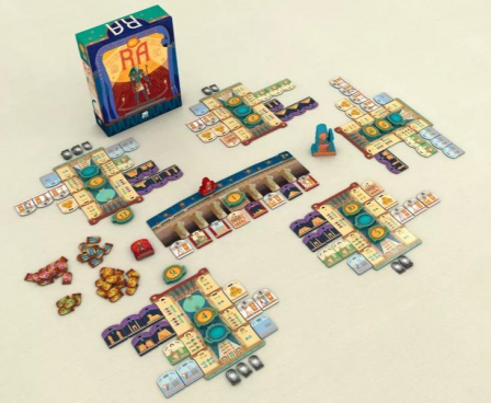 Ra is an auction and set-collection game with an Ancient Egyptian theme. Each turn players are able to purchase lots of tiles with their bidding tiles (suns). Once a player has used up his or her suns, the other players continue until they do likewise, which may set up a situation with a single uncontested player bidding on tiles before the end of the round occurs. Tension builds because the round may end before all players have had a chance to win their three lots for the epoch. The various tiles either give immediate points, prevent negative points for not having certain types at the end of the round (epoch), or give points after the final round. The game lasts for three "epochs" (rounds). The game is easy to learn.