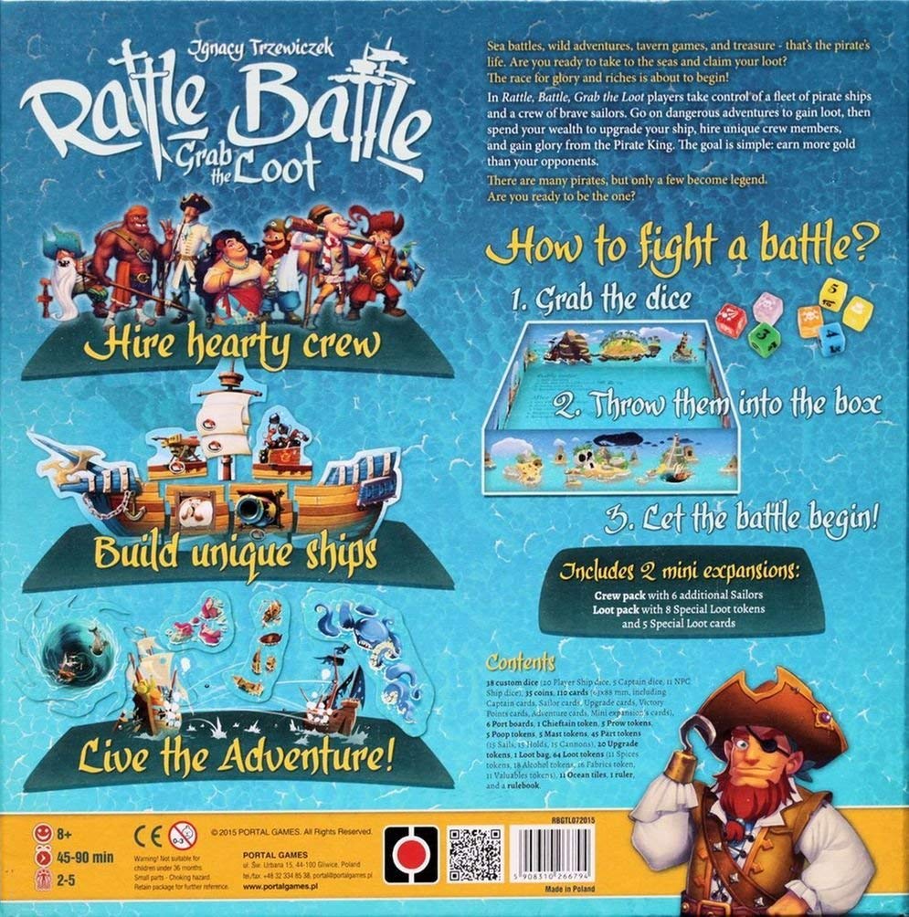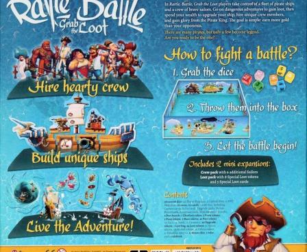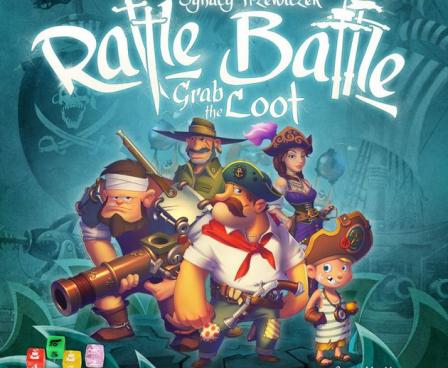 Rattle, Battle, Grab the Loot takes the fun of rolling dice and combines it with a rich scenario deck to make each game play differently. Each round, the players battle it out with merchant vessels and other ships, trying to grab as much loot as possible. One player takes dice from all the players, rattles them in their hand, then tosses them into the game box to resolve the battle. Where your dice land in the box, in addition to the symbols rolled, determines the results of the battle, then players claim their loot. Players may now return to port to upgrade their ship, hire new crew, or give their goods to the Pirate King for his favor.