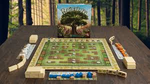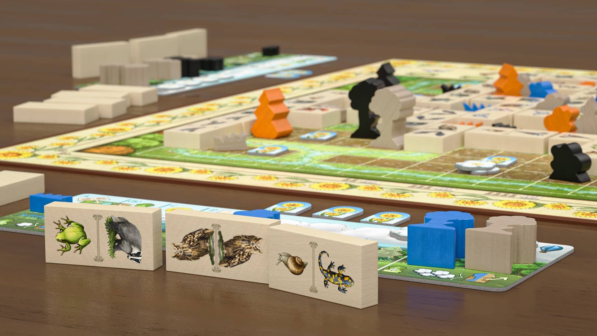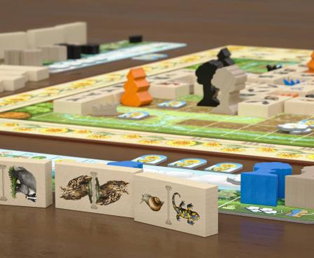 Each player gets a board with large pieces of wood in the form of turf, bushes, pines and oaks. These plants are used for the majorities on the large valley board and are available in a neutral color and in the respective player color. In addition, each player gets a stack of dominoes with two out of ten animal motifs on each of them.