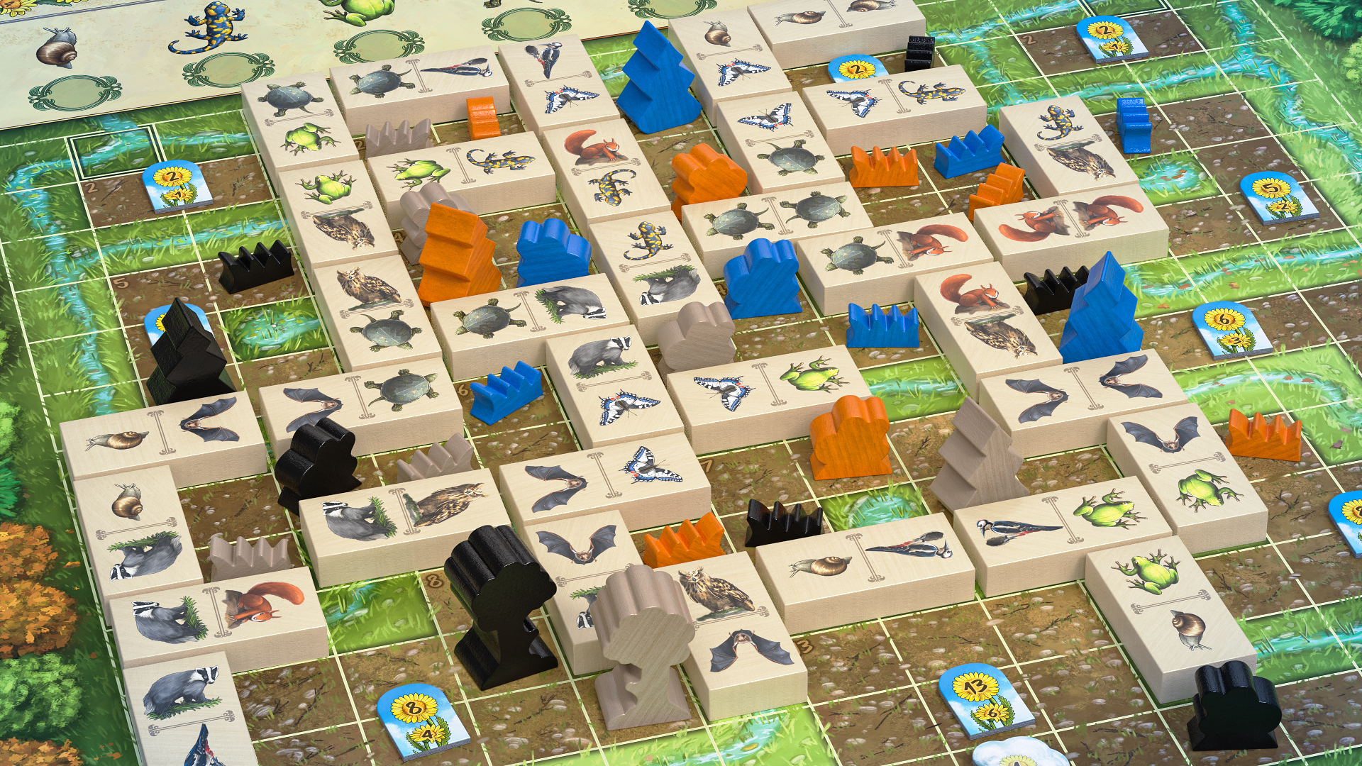On your turn, place one of the three dominoes in your hand on two brook spaces of the valley board. Of course, the domino must be adjacent to another domino that shows the same animal. If the placed domino borders a free space of a brown area, you can decide whether a tuft of grass or any other of your plants should be placed on that space. Tufts of turf have a value of 1, bushes of 2, pines of 3 and oaks of 4. After placing the plant, you score points for it and every plant piece that is already in this brown area and has the same or a lower value.