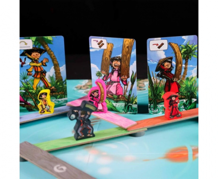 In game terms, players simultaneously select five action cards to be performed from the nine actions available and lay them down in order they are to be played. The turn is then resolved one card at a time. The actions allow players to place plank foundations, place planks, move their pawns, cancel other players' actions, or remove planks or foundation stones. As can be expected for a design with simultaneous action selection, the game is rather chaotic.
