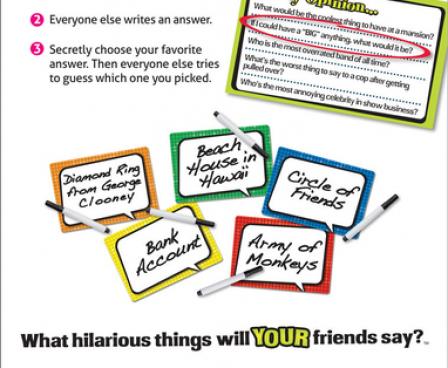 Say Anything is a light-hearted game about what you and your friends think. It gives you the chance to settle questions that have been hotly debated for centuries. For instance, "What is the most overrated band of all time?" or "Which celebrity would be the most fun to hang out with for a day?" So dig deep into your heart or just come up with something witty - this is your chance to Say Anything!