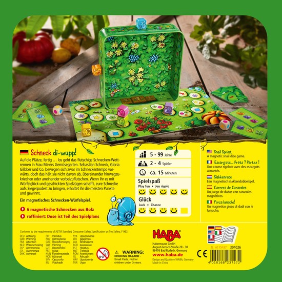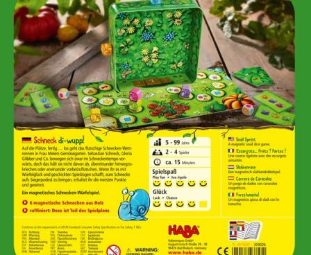 Content: 6 snails, 2 dice, 12 race cards, 1 game board, 1 podium, 1 base of the tin, 6x magnetic foils, 1 set of instructions.