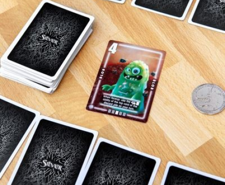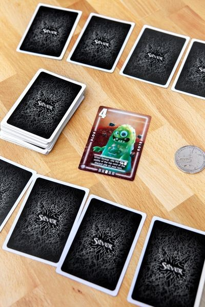 Silver Coin is a fast and engaging traditional card game with a werewolf twist! Everyone starts the game with five face-down cards, with each player being able to choose and see two of their cards. Cards are numbered 0-13, with the number showing how many werewolves the character on that card attracts, and each character (number) has a different special power.
