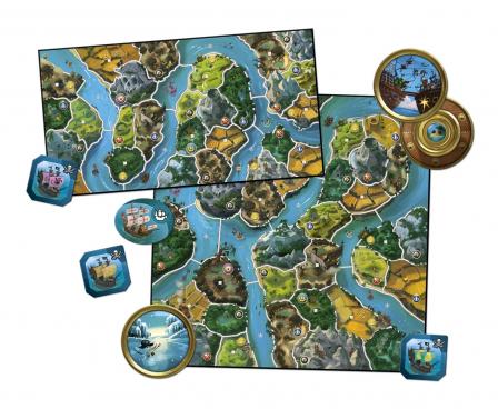 Small World: River World includes two double-sided game boards, i.e., four maps in total, one for each of the four possible player configurations.