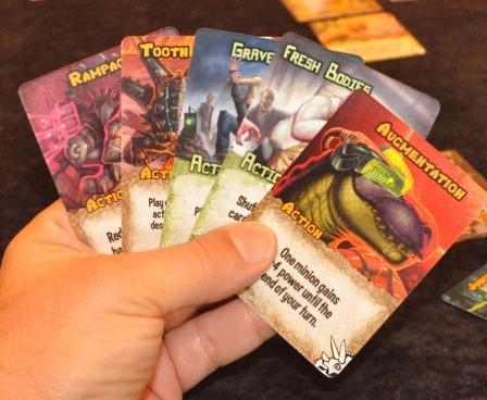 During play, Base cards (each with their own difficulties and abilities) are in play. You attempt to have the most power on the Base from your minions when the Base is smashed. Sounds easy? How easy is it when an opponent's Alien-Ninja decides to Beam Up your minions to other Bases - flat out Assassinate them? What about when the Pirate-Dinosaur player Full Sails in and releases King Rex to stomp your minions into the ground, or when the Wizard-Zombies use their Mystic Power to create an Outbreak, suddenly flooding minions onto the Base from the discard pile? Or what if you faced a Zombie-Dinosaur player instead and he created an Outbreak of massive beasts all at once?!?