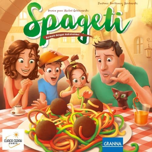 Spaghetti is a dexterity game in which players compete to pull out as many valuable spaghetti noodles as possible. There are 27 noodles on the plate that vary in colors, length and points: