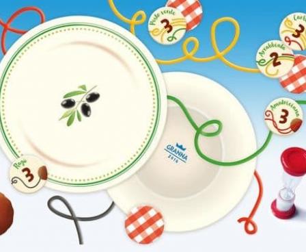 In Spaghetti Superiori, players earn extra points for fulfilling Italian recipes. There are 12 recipe tokens in total, each shows spaghetti ingredients. Players must remove those ingredients to claim the token. A player must get all of a token's ingredients during a single 20-second turn.