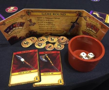 The raid is over, and the victorious Vikings gather in the chieftain's tent to divide the spoils of war! Piled high on a massive oak table are the best treasures taken during the raid: gleaming gems, shiny swords, fine armor, and magical artifacts! Once strong allies, the Vikings are taken by greed, and soon a heated debate ensues '' who will get which spoils? Fists pound the table, insults are made, and tempers rise!