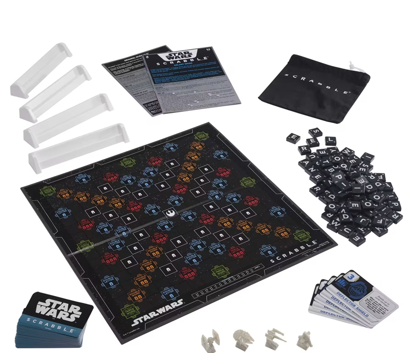 Includes playing board, 100 letter tiles, 4 racks, 56 cards, tile pouch, 4 starship mover pieces, Star Wars glossary and rules.
