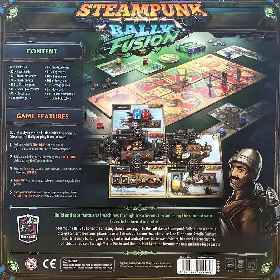 Steampunk Rally Fusion is a standalone game that can be combined with the original Steampunk Rally. It introduces new tracks with unique event cards, new part abilities (Gear Up and Overcharge), and a new card type: Secret Projects. It also debuts new custom dice representing powerful Fusion energy!