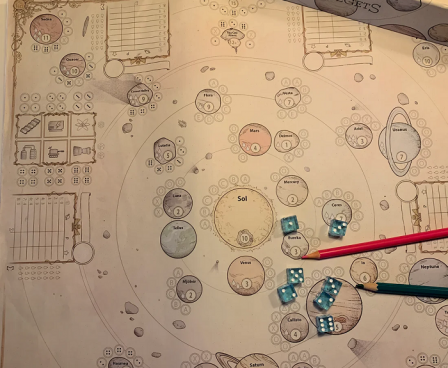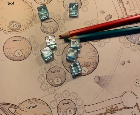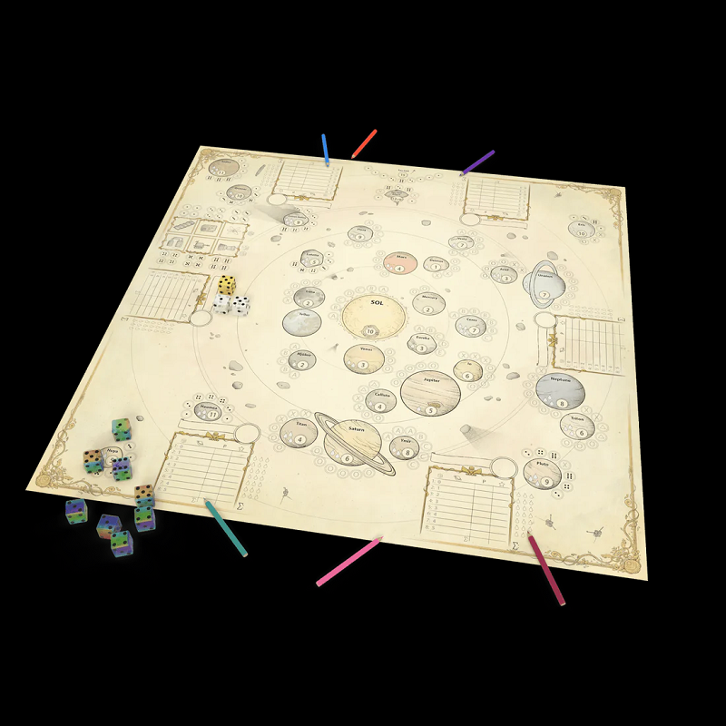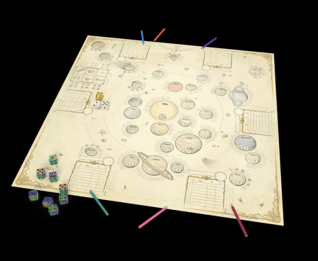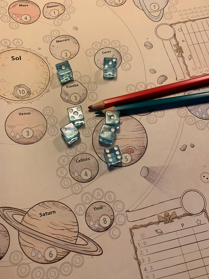 Roll the 7 dice to get combinations that lets you land on the available planets, moons, and other objects in our solar system. Draw directly on the sheet to show where you go and what you score. When you landed somewhere it becomes your spot, no one else can score for that combination.