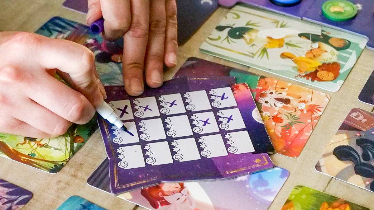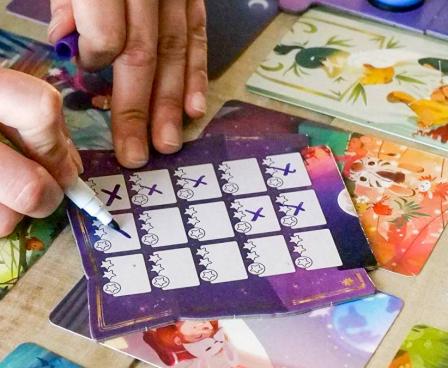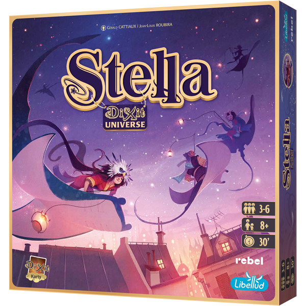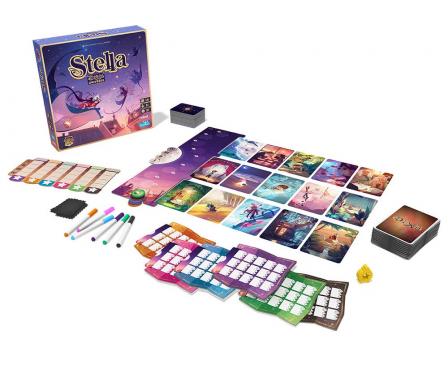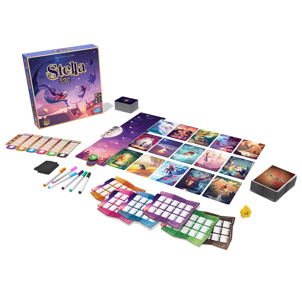 Stella is a competitive game in the Dixit universe. In each round, players interpret Dixit cards on a board after receiving a common clue word. Each player observes the Dixit cards and secretly associates these cards with the clue word, marking on their erasable personal slates the cards that they choose. Selecting the same cards as the other players allows you to score more points. Conversely, selecting a card that no one else chooses may cost you dearly.