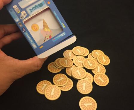 In "Ingredients and Recipes of the Mysterious Wizard', there are six vending machines placing on the game box. During a player's turn, the active player either buys a food card from one of the vending machines, or takes all the coins from one of the machines. Each food card is contained of an ingredient and a recipe. The recipes provide victory points in the end of the game, as the required ingredients are satisfied. Once a player purchases their fifth food card, all other players take one more action, and a Final Coin Shake occurs. Score the recipe points at the bottom of the food cards. Each ingredient may be scored multiple times. Each fake coin is worth negative 1 point. The player with the most points wins.