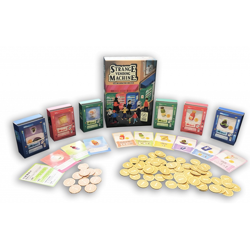 Strange Vending Machine is a fast-paced and light family game. Players choose which vending machines to buy food from in order to score points. If a player has no cash in hand, they can shake money out from a vending machine, so watch carefully and observe which vending machines have the most money! Strange Vending Machine comes with two rule sets: "Muscle Man's Purchase Challenge" and "Ingredients and Recipes of the Mysterious Wizard". The two games have independent rule sets and cannot be combined in play.