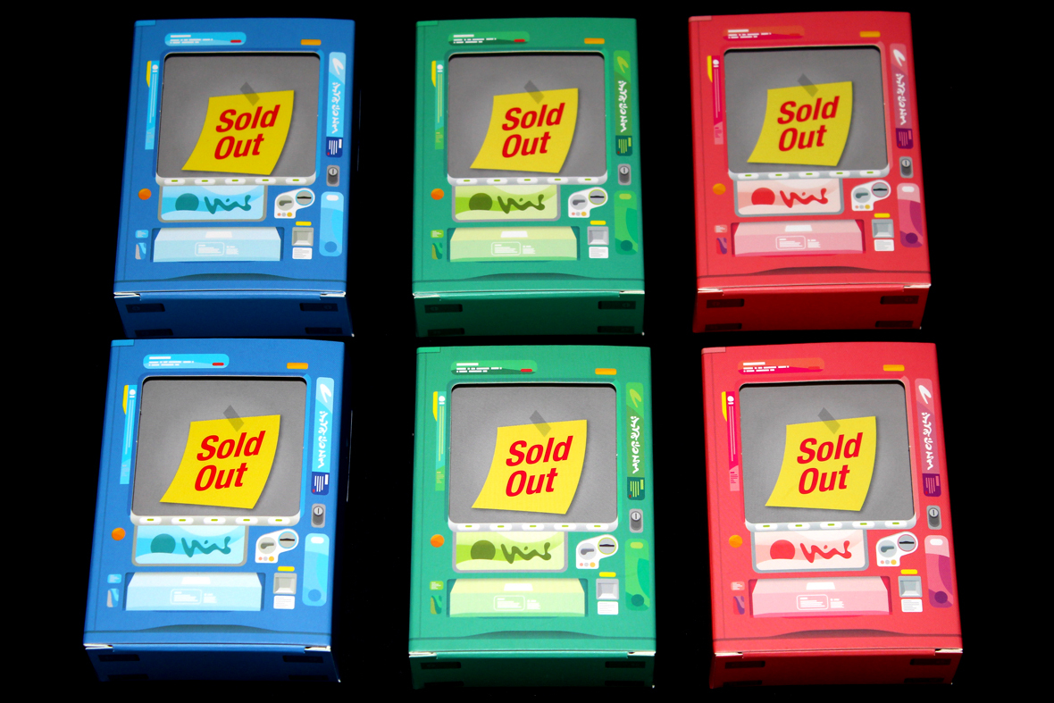 Numerous vending machines are placed at a busy corner of the city. When pedestrians put coins into these machines, surprises await them as they open the packages.