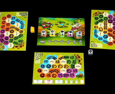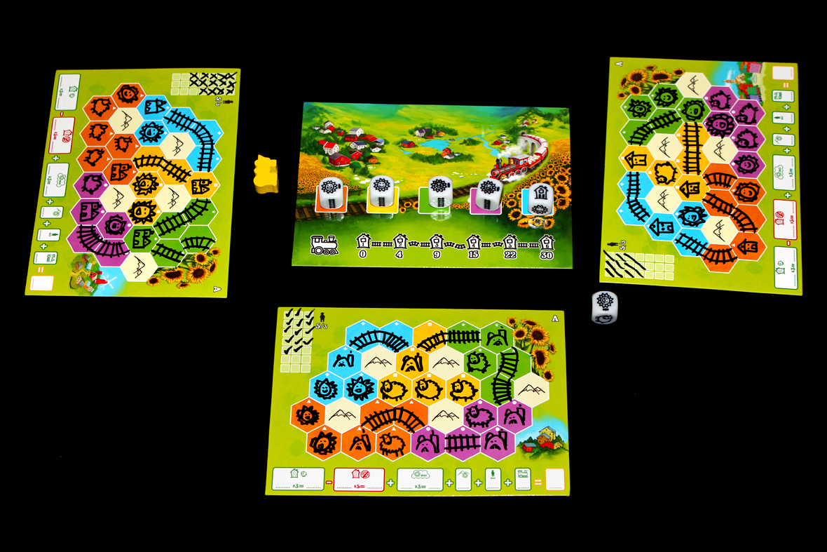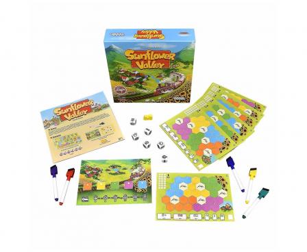 In Sunflower Valley, you draw your own mountain valley based on the tactical use of a shared pool of dice. Spread your villages throughout the valley and connect them with railways to earn points. Meanwhile, gain extra rewards for cheering up your villagers by cleverly planting sunflowers around the mountains. Remember that your villagers need enough sheep, too! And there are other players out there competing for the most valuable dice, so grab a pen and start drawing your valley in this creative strategy game!