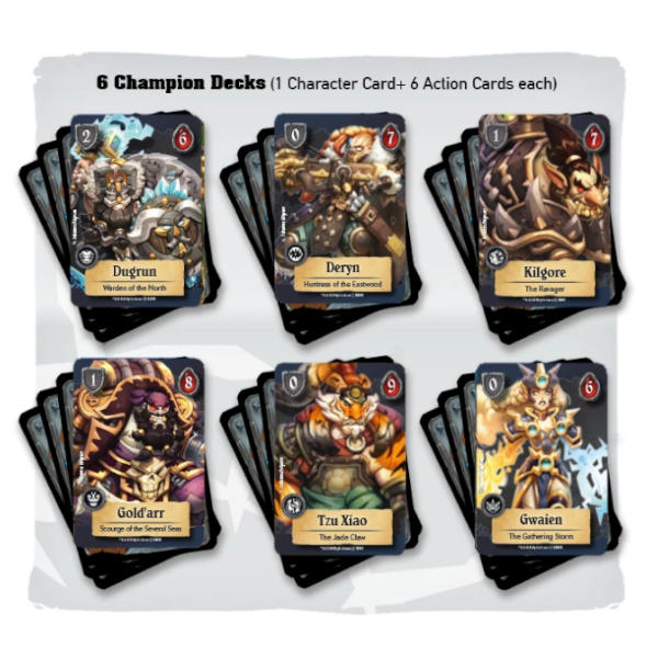 Super Fantasy Brawl is a fun, fast-paced competitive miniatures board game. Players select a team of three champions and combine their unique action cards to create a synergistic action deck. The game is faction-free, so players have their choice of any combination of champions they wish. Each turn, the players use their hand of action cards to maneuver, attack, displace enemies, and claim objectives to score victory points.