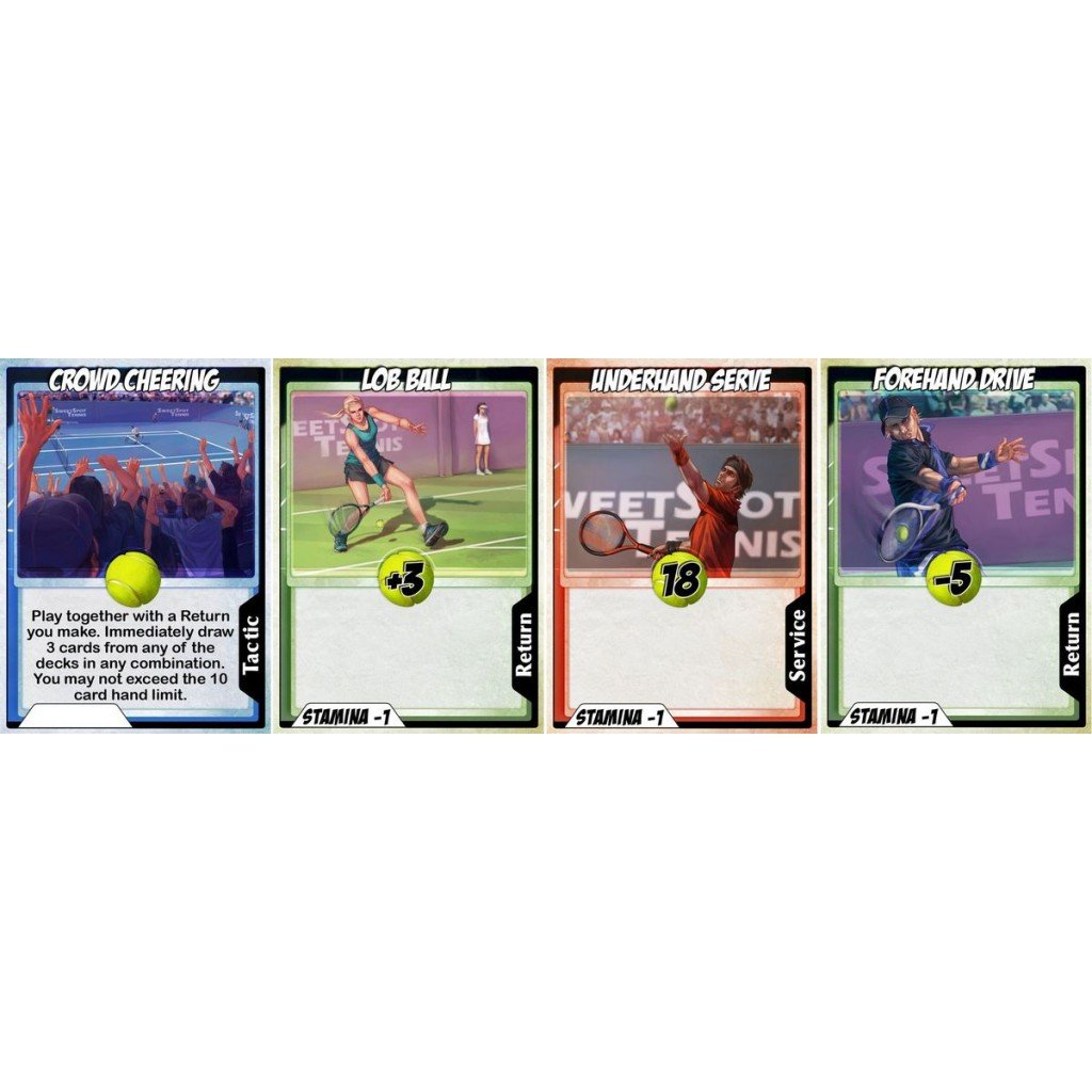 Sweet Spot uses a uniquely designed 'numbers system' to simulate the tennis ball's position and allows players to feel a realistic strength control of their swings where they can literally hit the ball lightly or drive it down hard. Powerful Tactic cards can tilt the balance and are at the same time highly thematic - Bench allows one to regain more stamina in between rallies, Crowd Cheering allows one to perform better at critical moments and Egg Shot hits the ball so high in the sky that the opponent cannot take an accurate read on its position when it comes down.