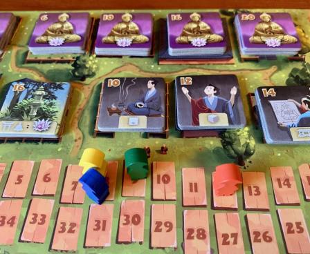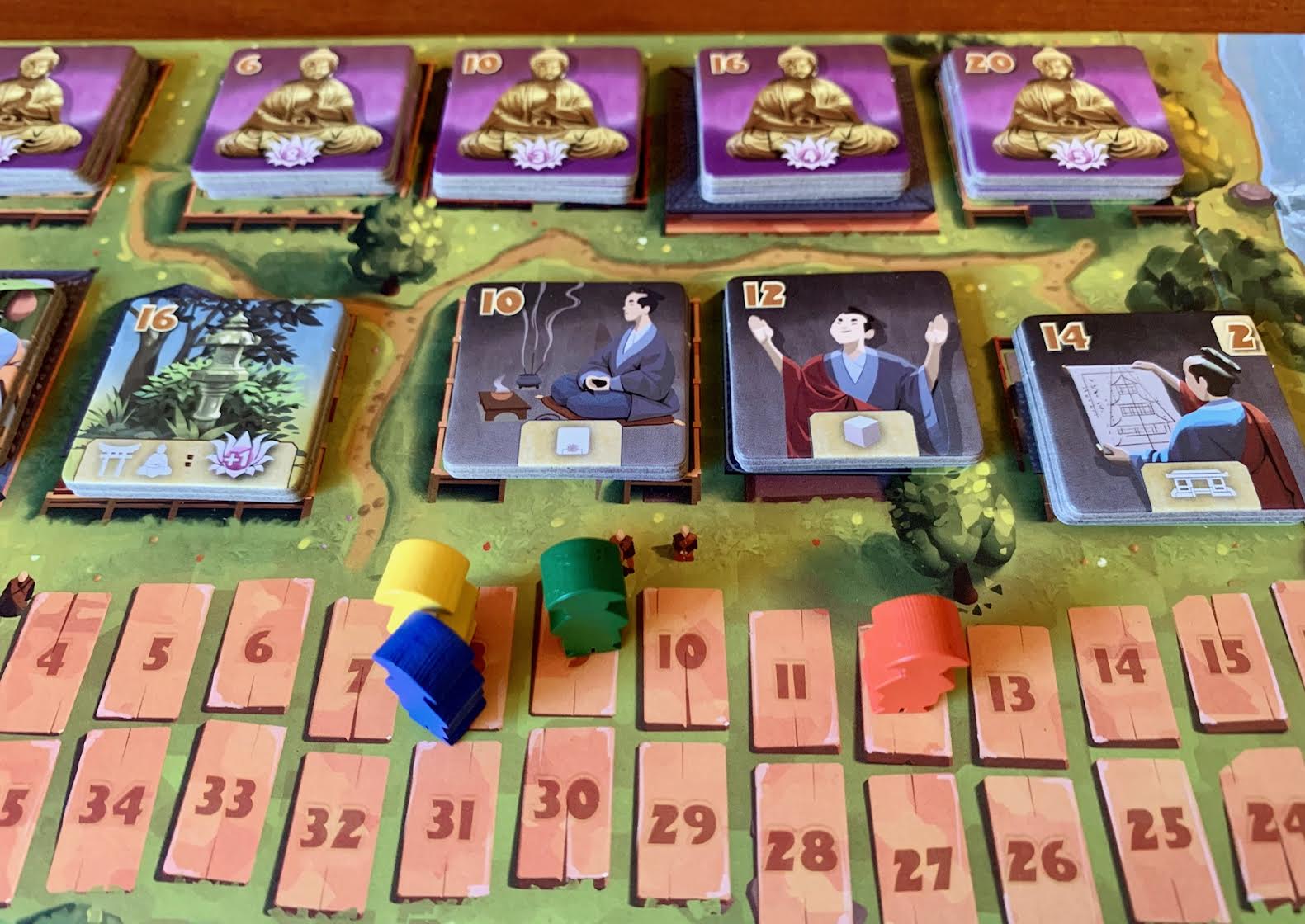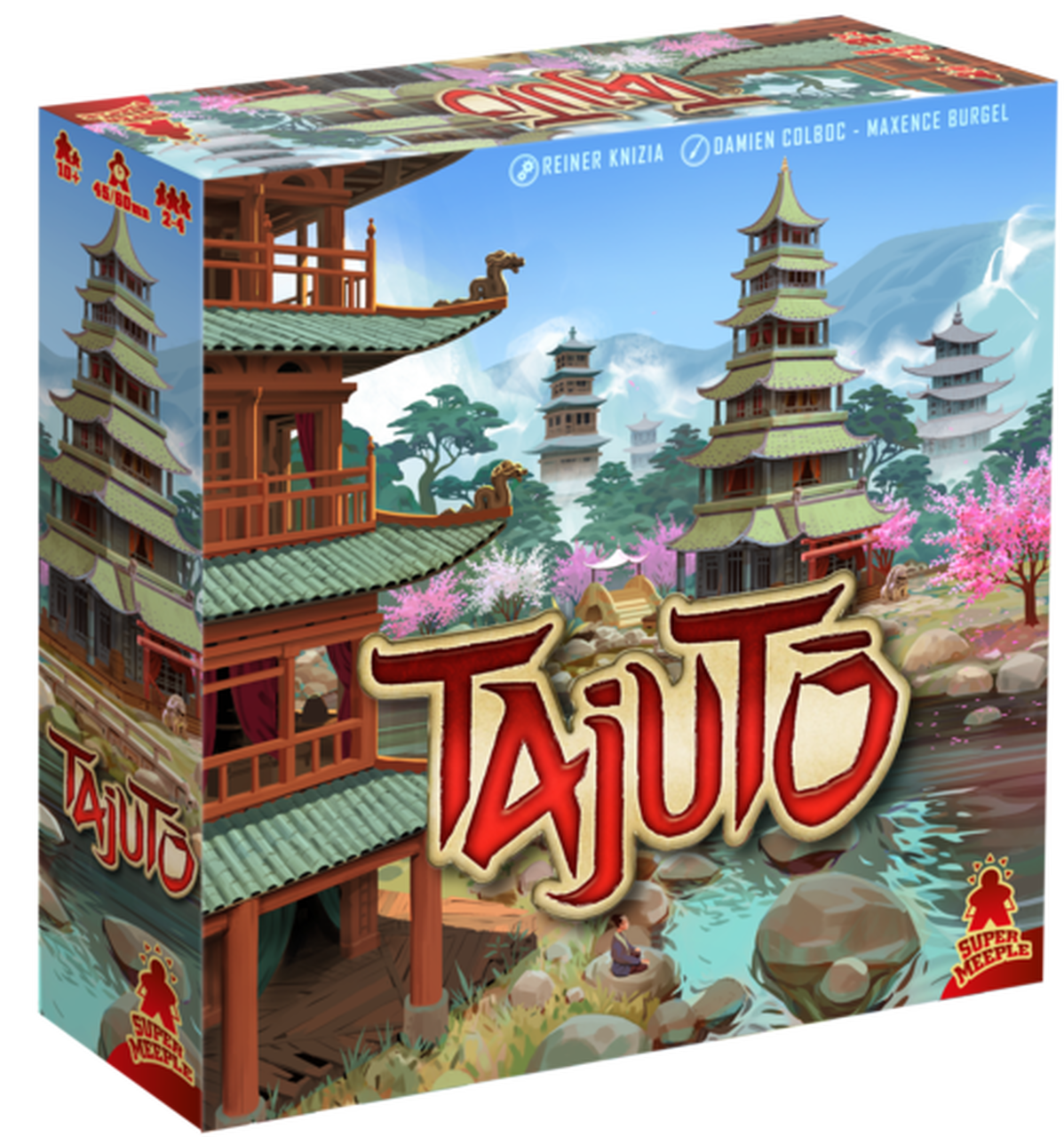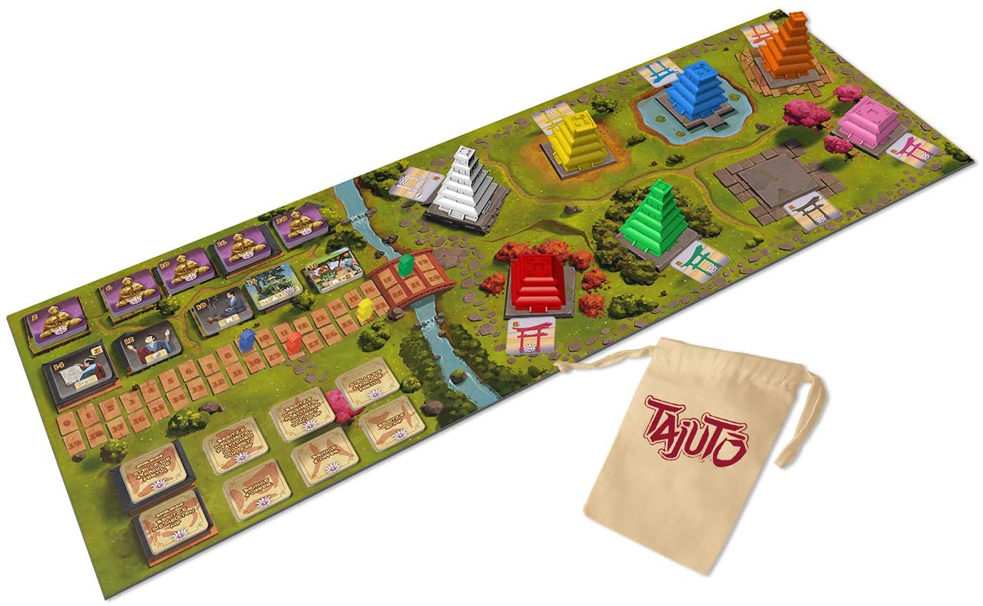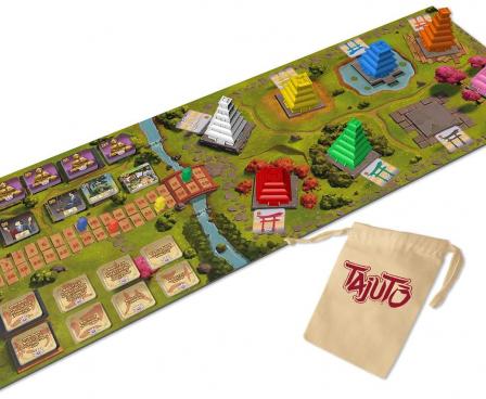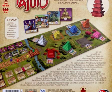 In Tajuto, players take on the roles of the Buddhist monks, trying to achieve the highest spirituality. On their turn, they can activate their action tiles to draw (and build) pagoda tiles from the bag, make offerings to gain meditation points, and acquire tiles that will help them progress more quickly or earn them spirituality points. Activating more than one action tile or acquiring tiles costs meditation points. The game ends once the fourth pagoda is finished. The player with the most spirituality points wins.
