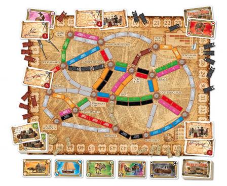 Players take turns until someone has no more than two carts in their supply, then each player takes one final turn, including the player who triggered the end of the game. Players then sum their points, scoring points for the routes that they've claimed during the game, the trade contract tickets that they've completed (by connecting the two locations on a ticket by a continuous line of their carts), and their standing among those who hold merchandise bonus cards. Whoever holds the most cards collects 8 points, with other players collecting fewer points. You lose points for any uncompleted contract tickets, then whoever has the high score wins!
